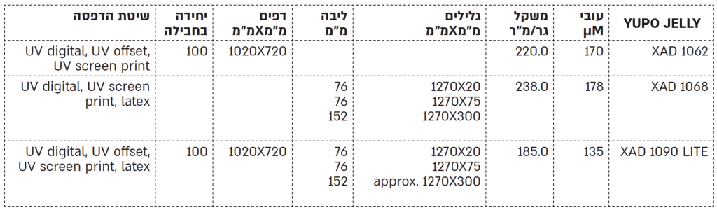הגירסה החדשה YUPO JELLY light מציעה מענה גמיש עם איכות הדפסה אחידה ושקיפות. עיינו במדריך הטכני לקבלת מידע והמלצות לטיפול והדפסה על גבי החומר.